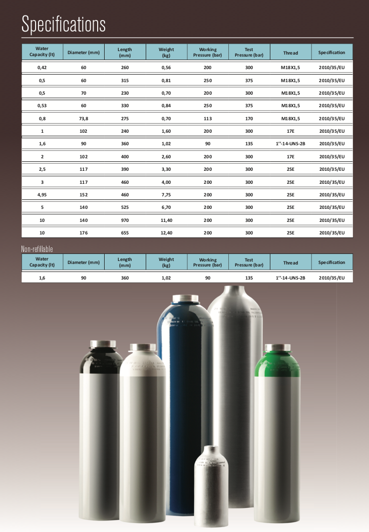 Aluminium alloy high pressure specialty gas cylinders for industrial service manufactured by MES range from 0,42 lt to 10 lt and are tested at various pressures.
